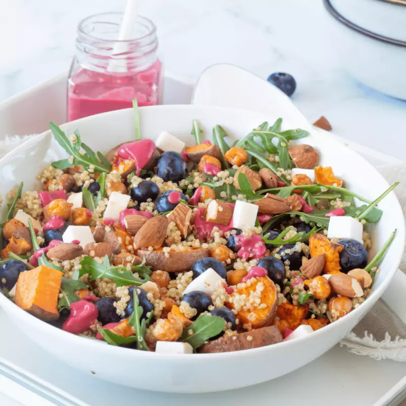 Begin met het bereiden van de zoete aardappel en de knapperige kikkererwten. Verwarm de oven voor op 200 graden en bekleed een bakplaat met bakpapier. Laat de kikkererwten goed uitleggen en dep deze wat droger. Snijd de zoete aardappel in kleine stukjes. Meng de aardappel en de kikkererwten met de olijfolie en de kruiden en bak ze voor 20 minuten in de voorverwarmde oven. Schep halverwege om. Kook ondertussen de quinoa gaar volgens de verpakking. Maak vervolgens de dressing. Stop alle ingrediënten in de blender en pureer tot een glad beslag. Wil je een iets zoetere dressing voeg dan wat meer maple syrup toe, voor een iets hartige dressing wat meer limoensap, peterselie of tahin. Verbrokkel de kaas en hak de amandelen grof. Kies of je de salade warm of koud wilt eten en laat of de quinoa afkoelen of ga door met de saladde klaarmaken. Meng de quinoa met de aardappel, kikkererwten, rucola, blauwe bessen amandelen en de kaas. Serveer de salade met de dressing apart. Geniet ervan!